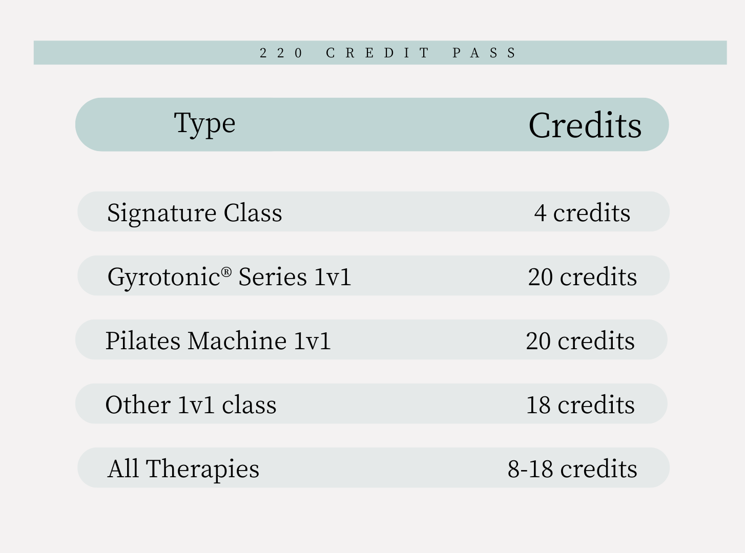 • Each Gyrotonic / Pilates/ Scoliosis ( Group A) private session use 20 credits per session