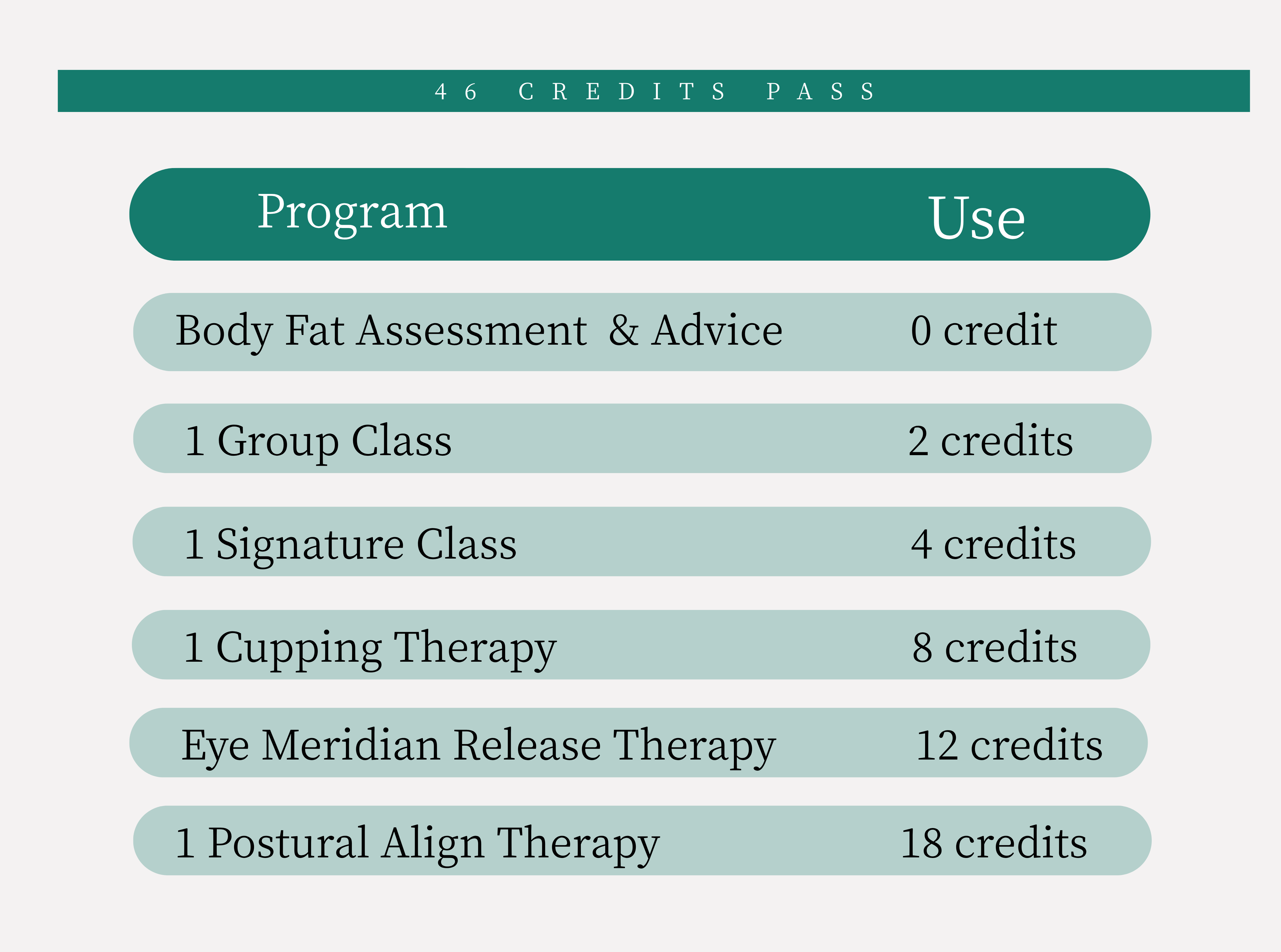 • Remaining credits may be redeemed 8 credits for one session of Cupping Therapy | 12 credits for Eyes Meridian Release Therapy. Redeemed 18 credits for one session of Postural Align Therapy.